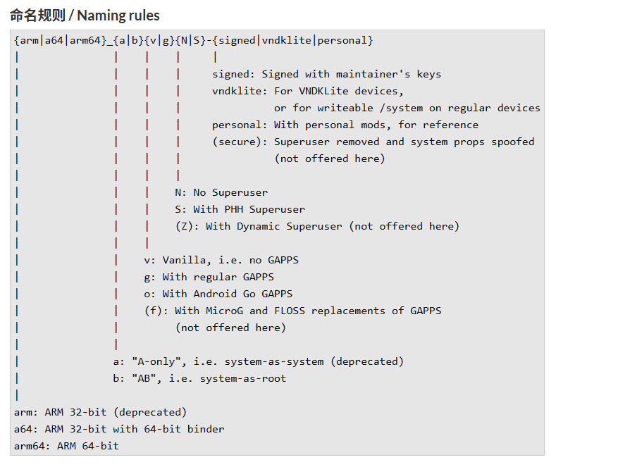 e.g. 一个arm64的非vndklite设备,sar(a/b)启用,我需要找一个包含精简谷歌套件并且不包含超级用户权限的GSI,则下载GSI时选择xxxxx(ROM名称)-arm64-XX(该ROM的安卓版本)-YYYY/MM/DD-bvN-slim.img