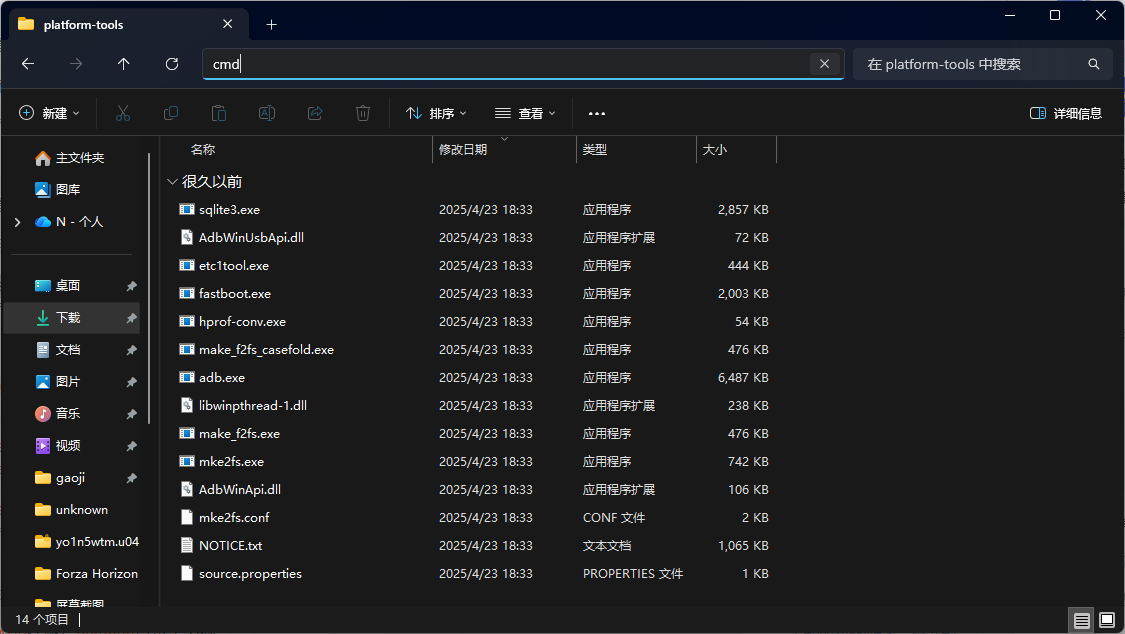 安装好驱动后打开解压好的platform-tools-latest-windows,在文件资源管理器上方目录框输入cmd回车打开命令行窗口