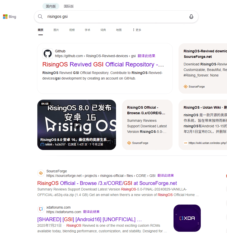 第二种简单粗暴,快速。在bing或者Google里搜索rom名称+gsi,比如RisingOS gsi,可以看到有很多结果,选择GitHub、sourceforge或者xda等可靠网站里的即可。